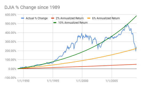 So, I propose a different (and much simpler) approach: assume a realistically sustainable growth rate over a long enough period and figure out where we would be if the market had grown at that pace. I picked 20 years as the period and charted the monthly percent change of the Dow Jones Industrial Average (DJIA) from 2,342.32 at the end of January 1989 to 8,131.33 at Friday’s close. The actual percent change is the blue line, and I plotted 3 other lines against it: 10% annualized growth in green; 6% annualized growth in orange; and 2% annualized growth in red.